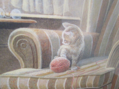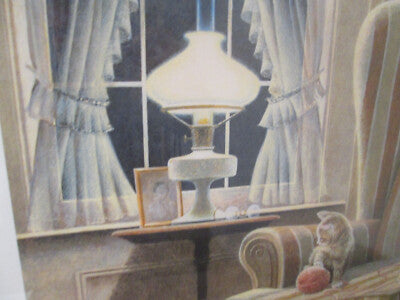 This charming framed print by Canadian artist James Lumbers, titled "Double Trouble," captures a whimsical moment with a ghostly mama cat and her playful kittens, inviting a sense of curiosity and warmth into any space. Pencil signed and numbered 482 of a limited edition of 490, its fine craftsmanship showcases Lumbers' unique ability to blend realism with a touch of the ethereal. Circa 1988, this piece not only reflects the artist's distinctive style but also adds a delightful narrative element to your decor, making it a perfect conversation starter in your home.