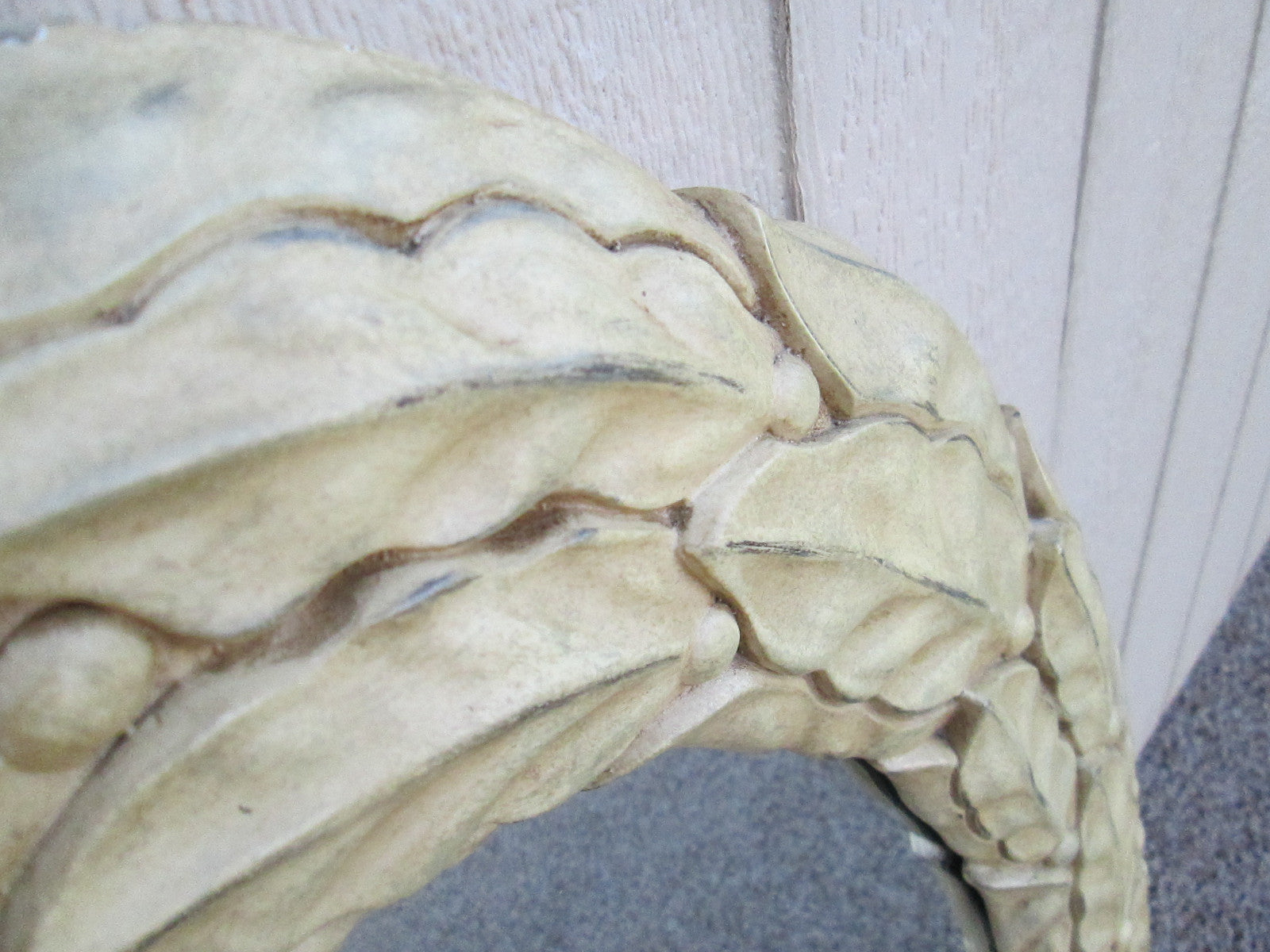 This charming oval mirror captures the essence of shabby chic decor with its delicately carved leaf motif, inviting a sense of romantic whimsy into any space. The soft ivory finish enhances its vintage appeal, while the original craftsmanship reflects a time when attention to detail was paramount. Perfect for brightening up a hallway or as a statement piece in a bedroom, this mirror not only serves a practical purpose but also adds a touch of artistic flair to your home. Its inviting character is sure to resonate with those who appreciate the beauty of well-loved antiques.