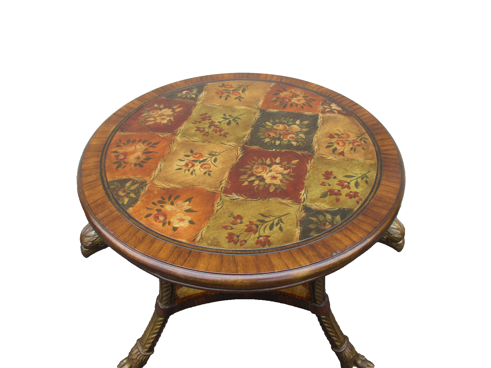 This charming round lamp table showcases a delightful blend of functionality and artistic flair, featuring intricately carved eagle head accents that add a touch of whimsy to any room. Crafted post-1950, it stands as a testament to the skilled craftsmanship of its time, with a sturdy construction that assures durability. Its multicolor finish invites versatility, making it an ideal accent piece for both classic and contemporary settings. Whether serving as a nightstand or a decorative stand for your favorite lamp, this table embodies a unique character that will surely spark conversation.