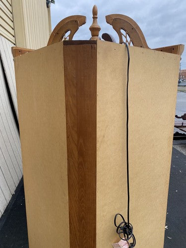 This charming oak corner curio cabinet exudes warmth and traditional elegance, making it a delightful addition to any room. Handcrafted with care, its rich grain and sturdy construction showcase the timeless appeal of fine woodworking. The plate glass shelves provide a perfect display for your cherished collectibles, while the soft glow of the built-in light enhances their beauty. This cabinet not only serves as a functional storage piece but also as a testament to the craftsmanship of its era, inviting stories and memories into your home.