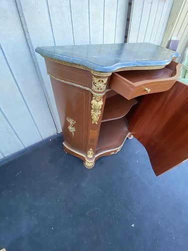 This exquisite marble top console table beautifully marries elegance with functionality, serving as a stunning focal point in any room. The intricate figural details carved into the sturdy wood base showcase the craftsmanship of a bygone era, while the smooth, cool marble surface invites both admiration and use. Perfect for displaying cherished decor or as a versatile serving piece, this console table embodies a timeless charm that will enhance your home for years to come. Its warm character and historical significance make it a delightful addition to any antique collection.