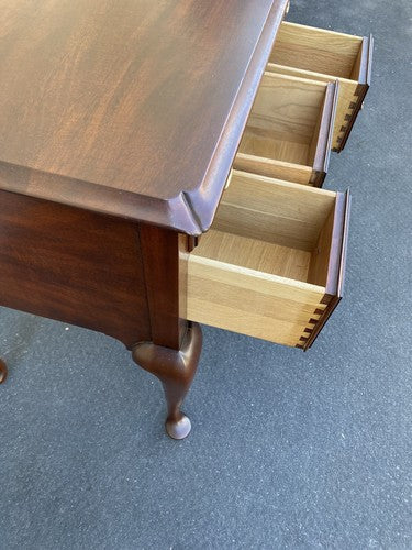 This exquisite Henkel Harris Virginia Galleries low boy dresser showcases the timeless elegance of Chippendale design, crafted from rich mahogany that highlights the natural beauty of the wood. With its four spacious drawers, each meticulously handmade, this piece offers both functionality and a touch of classic sophistication, making it a perfect addition to any room. The sturdy construction reflects the quality and attention to detail that Henkel Harris is renowned for, ensuring this dresser will be a cherished heirloom for generations to come.