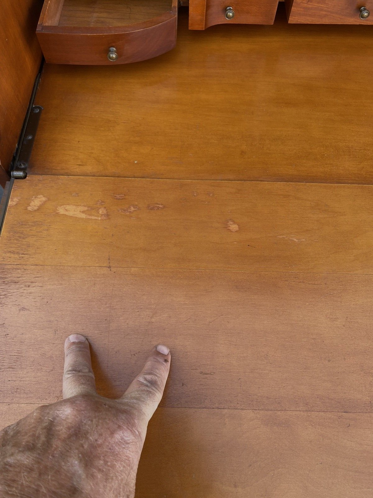 This charming Monitor Furniture maple secretary desk, complete with a graceful bookcase top, offers a delightful blend of functionality and vintage appeal. The expertly crafted dovetailed drawers reflect a commitment to quality construction, while the warm tones of the maple wood create an inviting atmosphere. Although the writing surface shows some signs of wear, it adds to the character of this piece, making it a perfect addition to any home office or study. This desk is not just a workspace; it’s a piece of history waiting to inspire new stories.