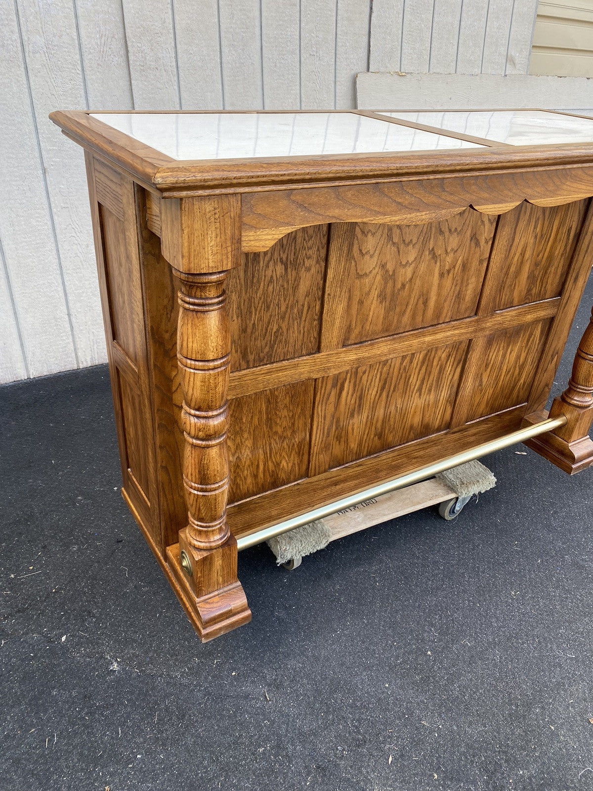 66334 Oak Tile Top Bar Liquor Cabinet with 2 Barstools Swivel Stool Chair s