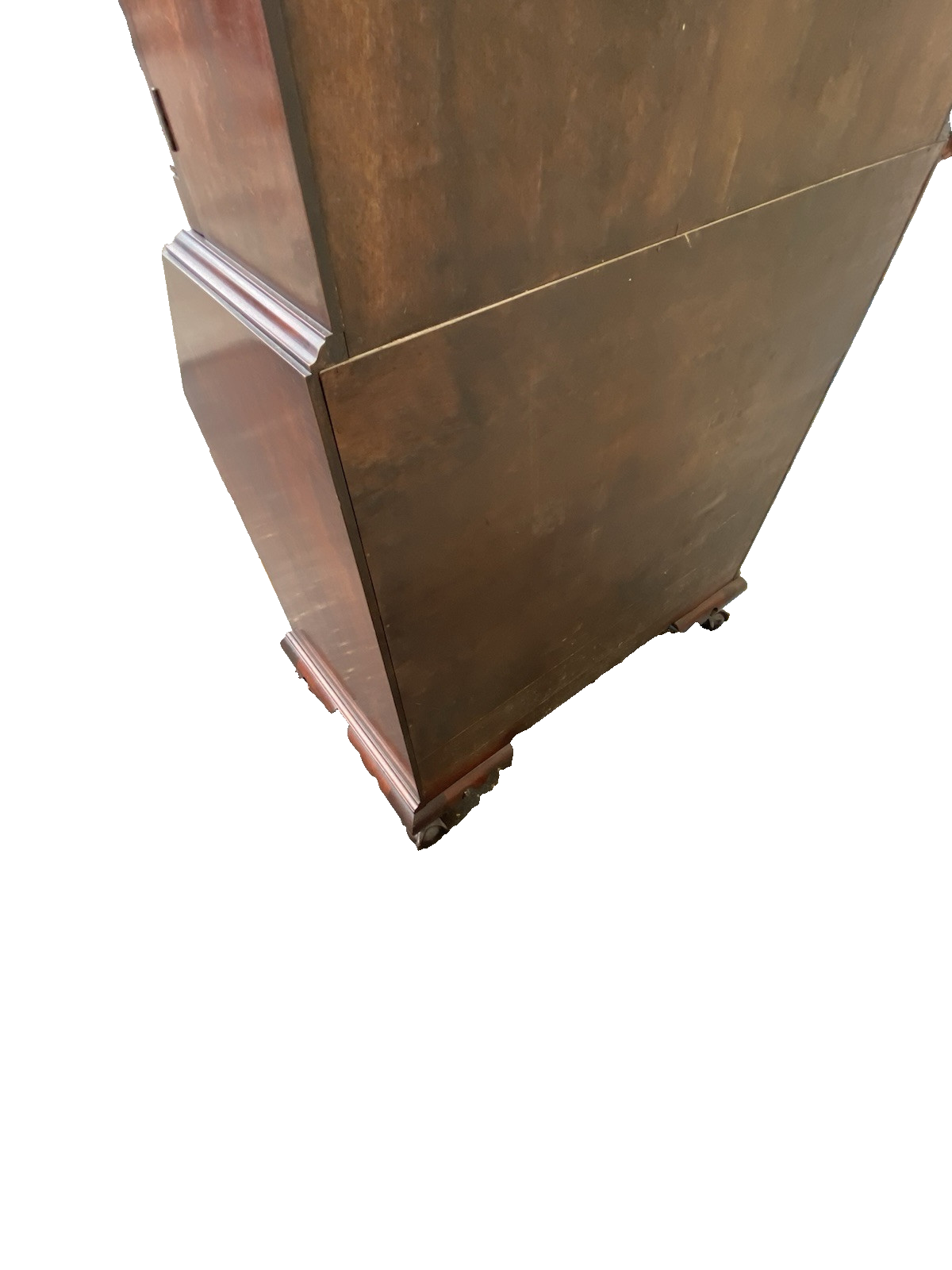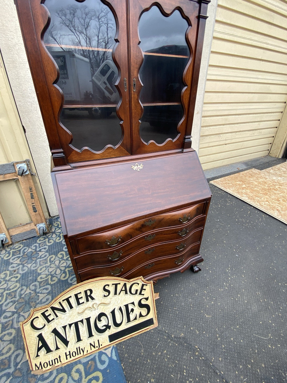 This exquisite Vanleigh Furniture custom-made secretary desk showcases the timeless elegance of Chippendale style, crafted from rich mahogany that exudes warmth and sophistication. With its gracefully curved lines and intricate details, this piece features a bookcase top with two shelves, perfect for displaying your favorite volumes, and four drawers that offer ample storage for letters and documents. Its sturdy construction reflects a commitment to quality that has stood the test of time, making it a charming addition to any study or home office. Embrace the character and history this desk brings, inviting both functionality and style into your space.
