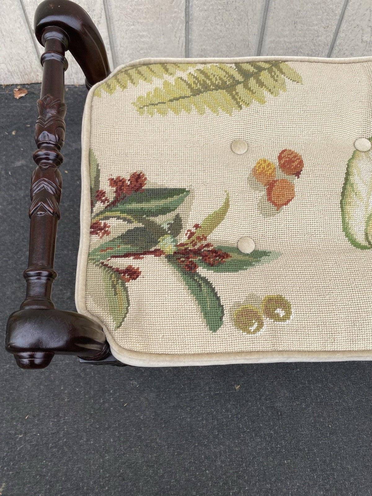 This charming mahogany vanity bench, crafted by Sam Moore in the mid-20th century, exudes timeless elegance with its Hepplewhite-inspired design. The multicolored upholstery adds a touch of whimsy, making it a perfect accent piece for any room. Sturdy and well-constructed, it invites you to sit and reflect, whether by a window or as part of your vanity setup. With its rich history and handcrafted quality, this bench is not just a functional seat but a delightful conversation starter that brings warmth to your home.