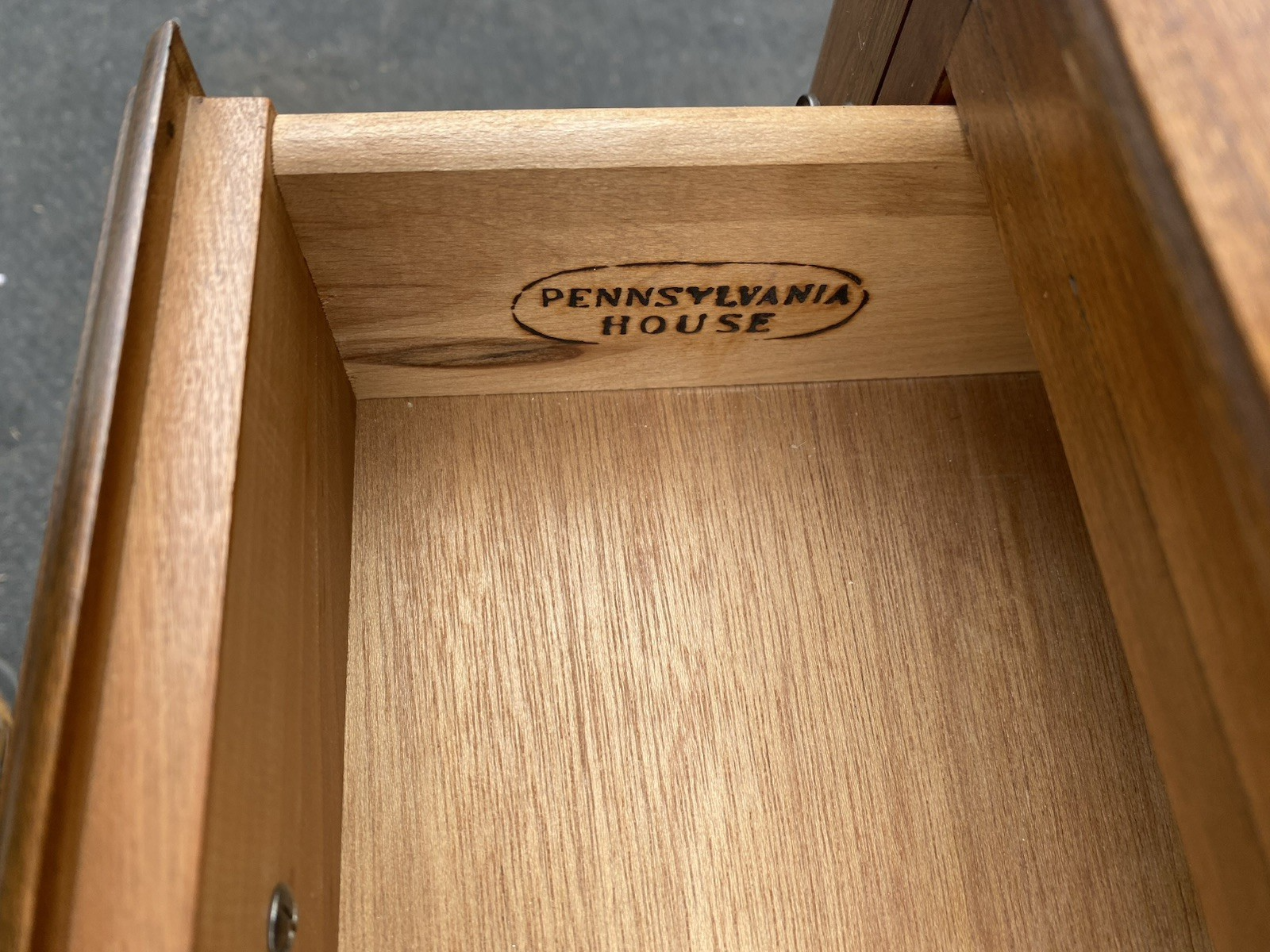 This charming Pennsylvania House secretary desk, complete with a graceful bookcase top, showcases the timeless beauty of solid cherry wood. Crafted around 1980, its dovetailed drawers reflect a commitment to quality and craftsmanship that is hard to find in modern pieces. The desk’s warm finish and elegant lines invite you to create a cozy workspace or display treasured books and photos. This piece not only serves a functional purpose but also adds a touch of history and character to your home, making it a delightful addition to any room.