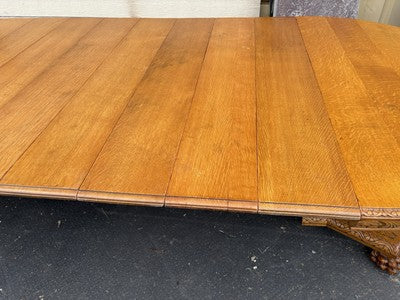 This exceptional Victorian dining table, crafted from rich oak around the turn of the 20th century, exudes both elegance and functionality, featuring a remarkable ten leaf design that allows for effortless expansion to accommodate gatherings of all sizes. The table's intricate hand-carved skirts on two of the leaves showcase the meticulous craftsmanship of its era, while the warm, antique finish tells stories of family meals and celebrations shared over the years. A centerpiece of any dining room, this rare piece invites you to create new memories while honoring its storied past.