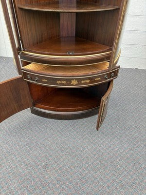 This exquisite Drexel Oriental Corner China Cabinet is a splendid blend of functionality and artistry, showcasing intricate carvings that reflect the timeless elegance of Asian design. With its charming corner silhouette, this cabinet offers a unique space-saving solution while providing a beautiful display for your treasured china or collectibles. Crafted with care and attention to detail, its sturdy construction ensures that this piece will be a cherished addition to your home for years to come. Embrace the warmth and character of this vintage cabinet, perfect for adding a touch of history to any room.