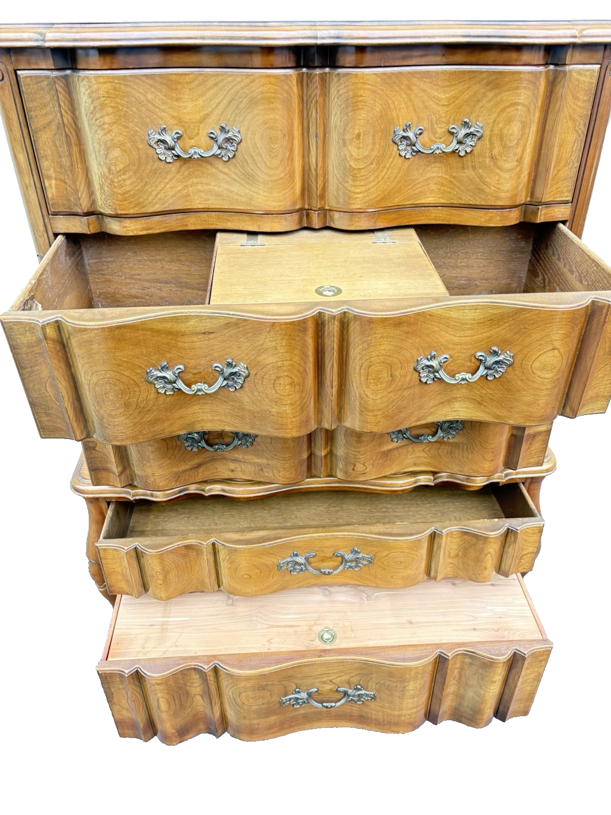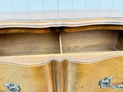 Embrace the charm of French Country style with this exquisite PHENIX Furniture high chest dresser, crafted from rich cherry wood that showcases the beauty of its natural grain. With five spacious drawers, this sturdy piece not only offers ample storage but also serves as a striking focal point in any bedroom. Its elegant lines and timeless design reflect the artistry of mid-20th century craftsmanship, making it a delightful addition to your home that carries a sense of warmth and history. Perfect for those who appreciate quality and character in their furnishings, this dresser is ready to become a cherished part of your family’s story.