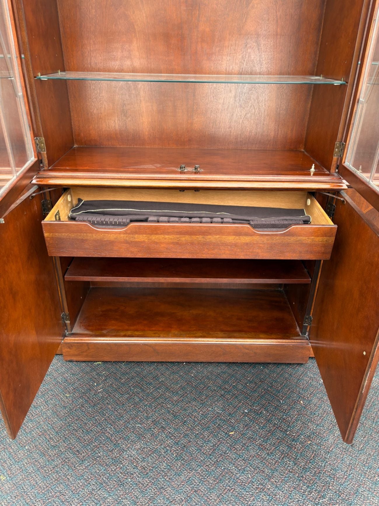 | Features | Glass doors with lattice design, adjustable glass shelves, ample storage, original hardware |