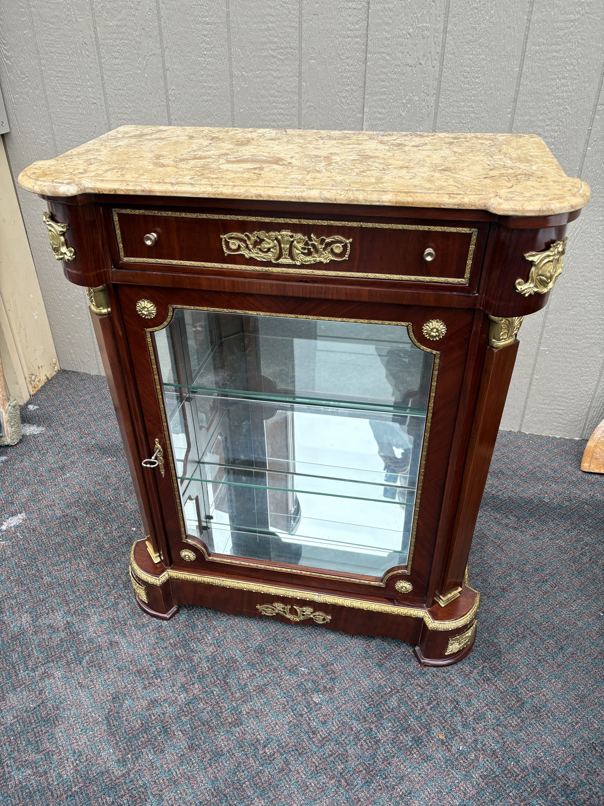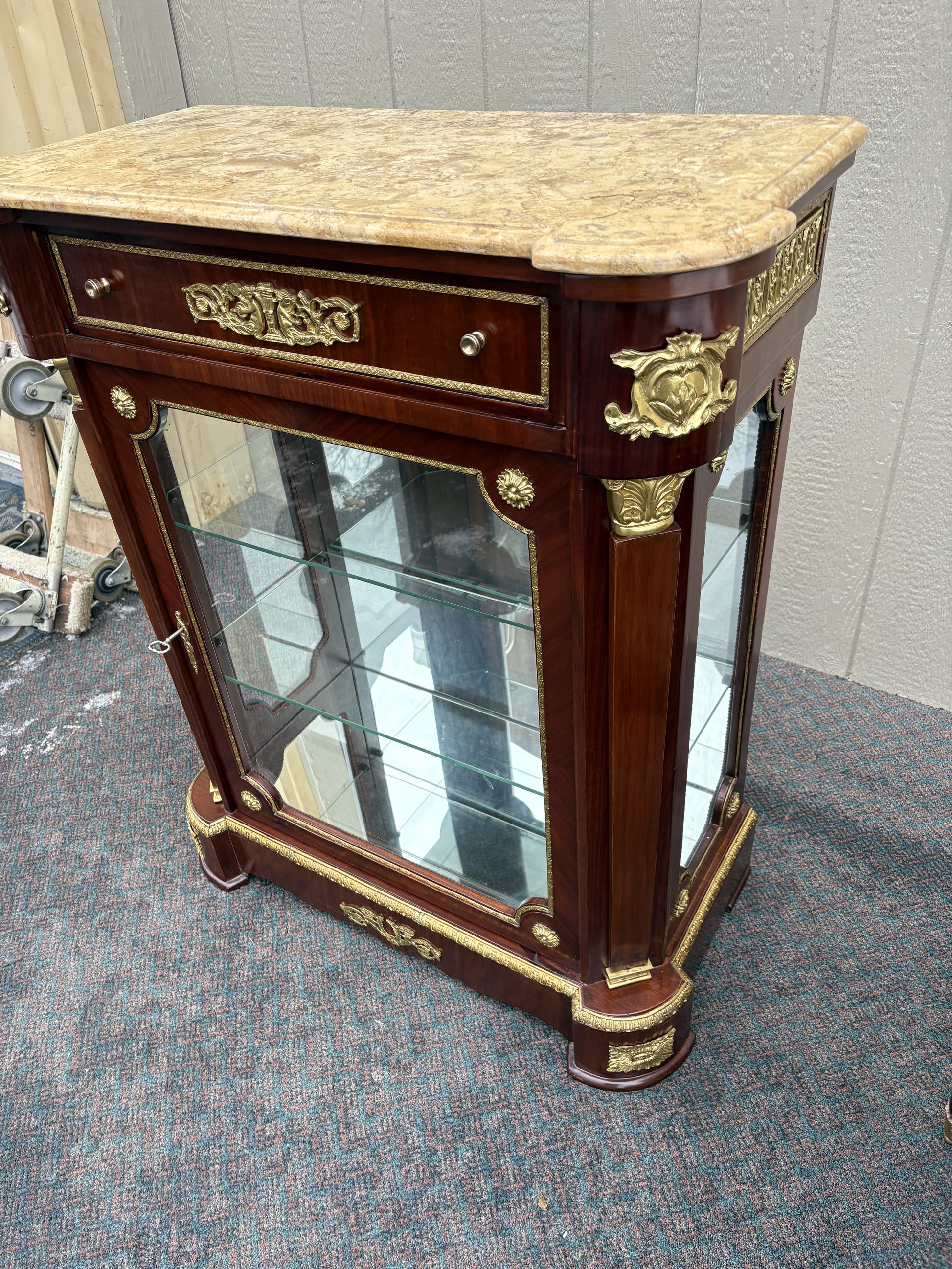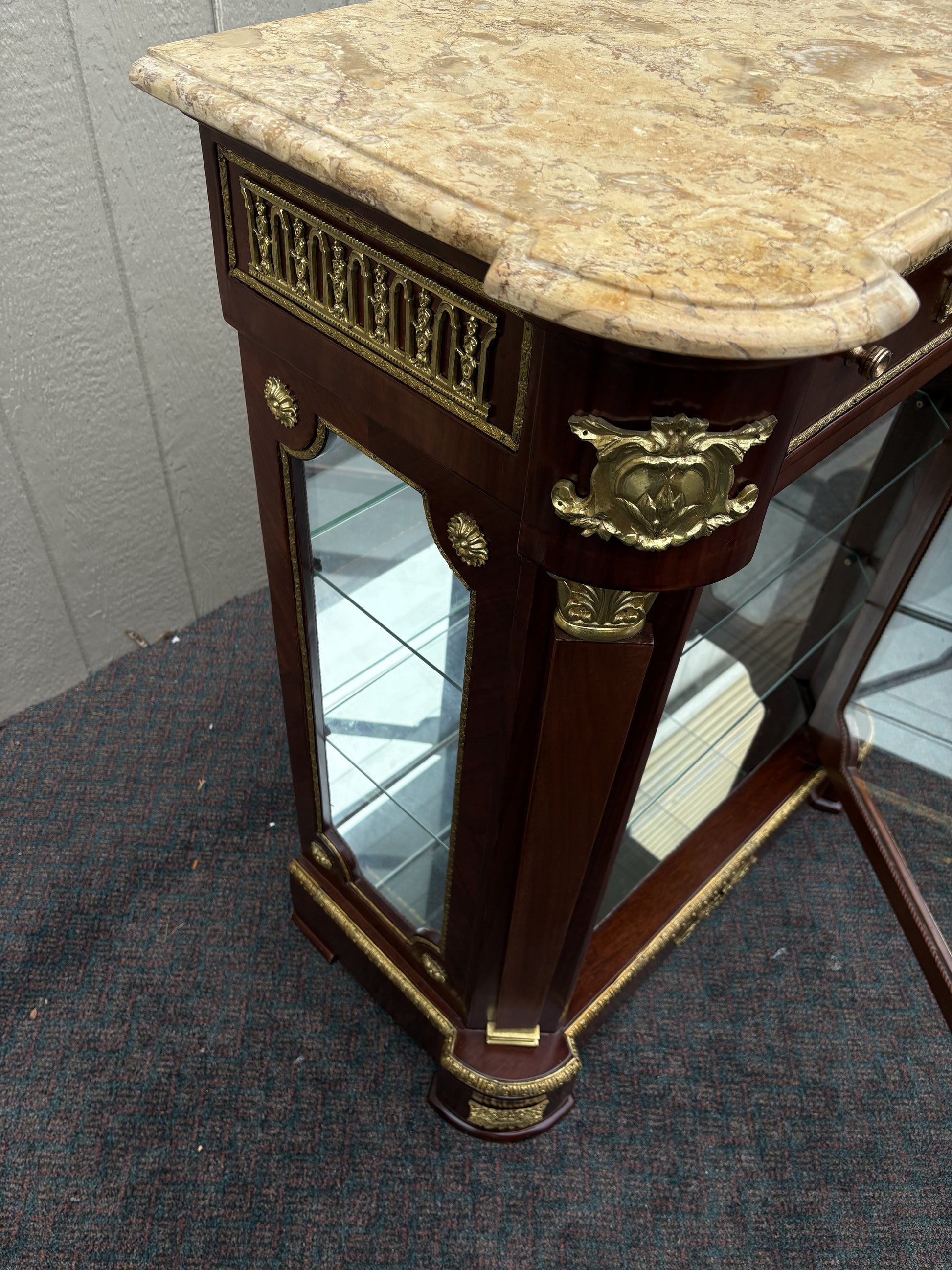 This exquisite Louis XV style curio cabinet is a stunning blend of elegance and craftsmanship, perfect for showcasing your cherished collectibles. The cabinet features a beautifully veined marble top, adding a touch of luxury to its overall look. Crafted from rich mahogany, the piece is adorned with intricate brass accents that highlight its classic design. The glass front and sides allow for an unobstructed view of the interior, with adjustable glass shelves to accommodate various display needs. This curio cabinet is a timeless addition to any sophisticated home decor.