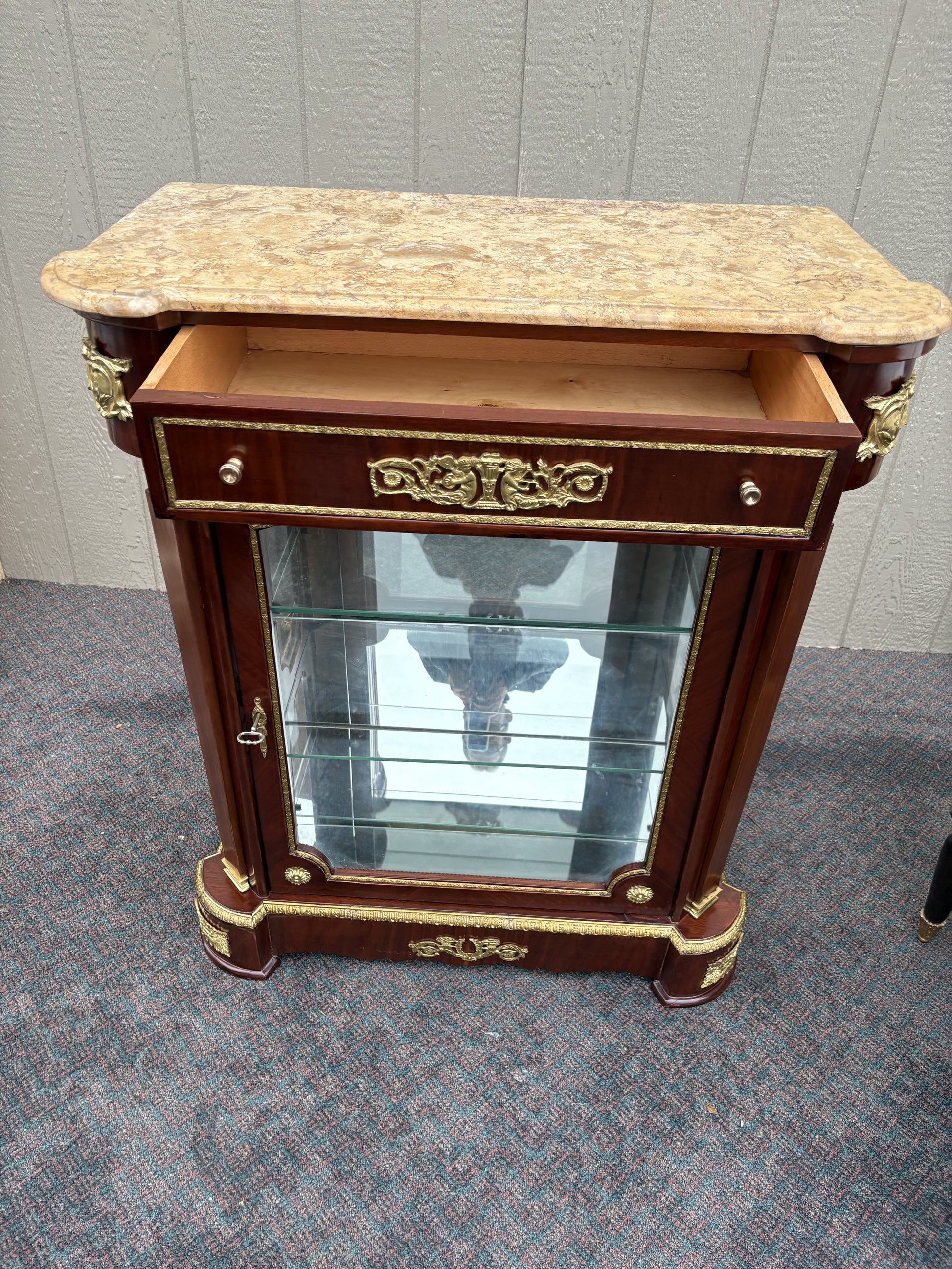 | Features | Marble top, Brass accents, Glass shelves, Glass front and sides, Intricate detailing |
