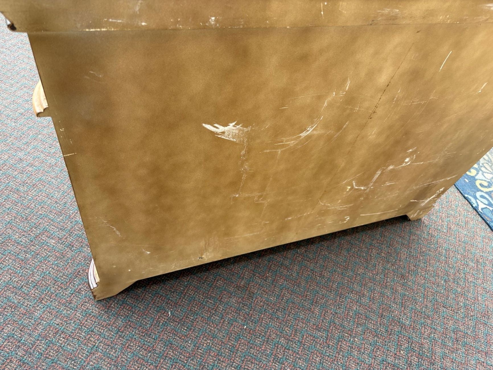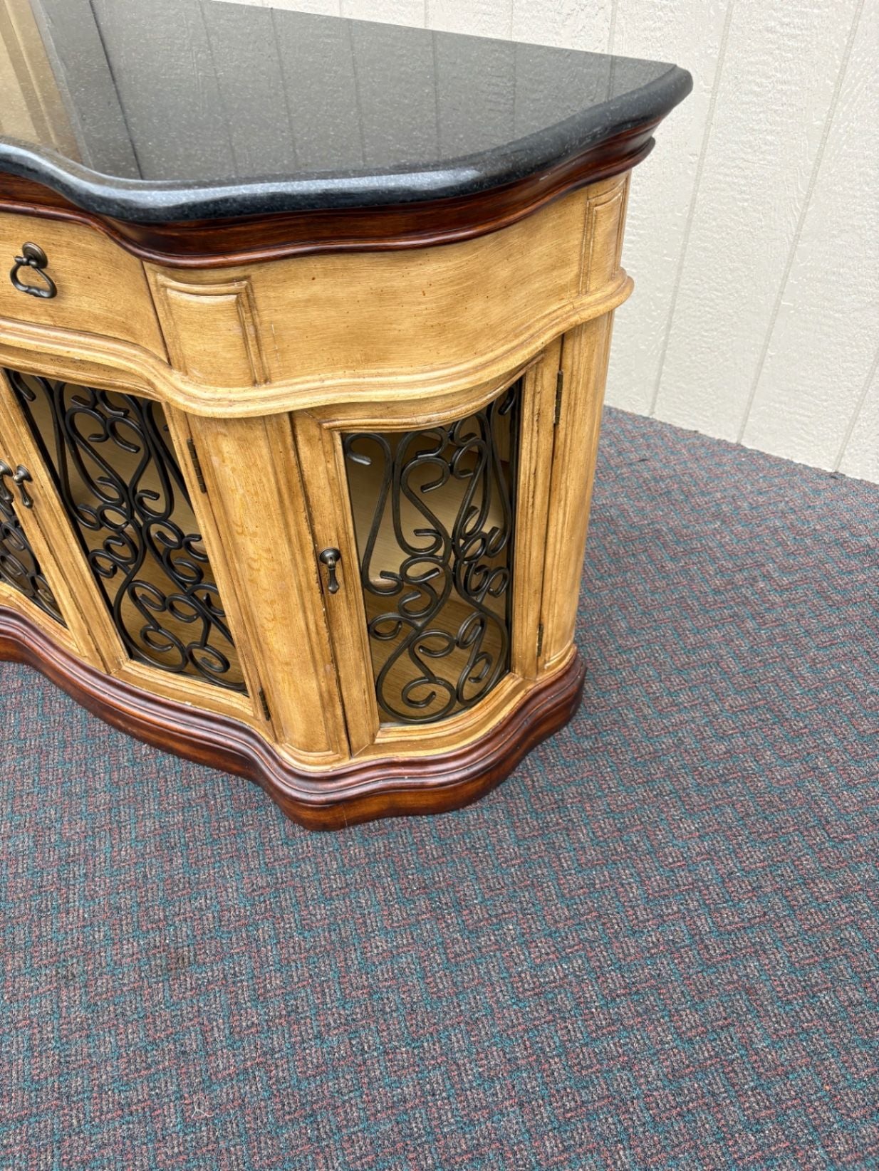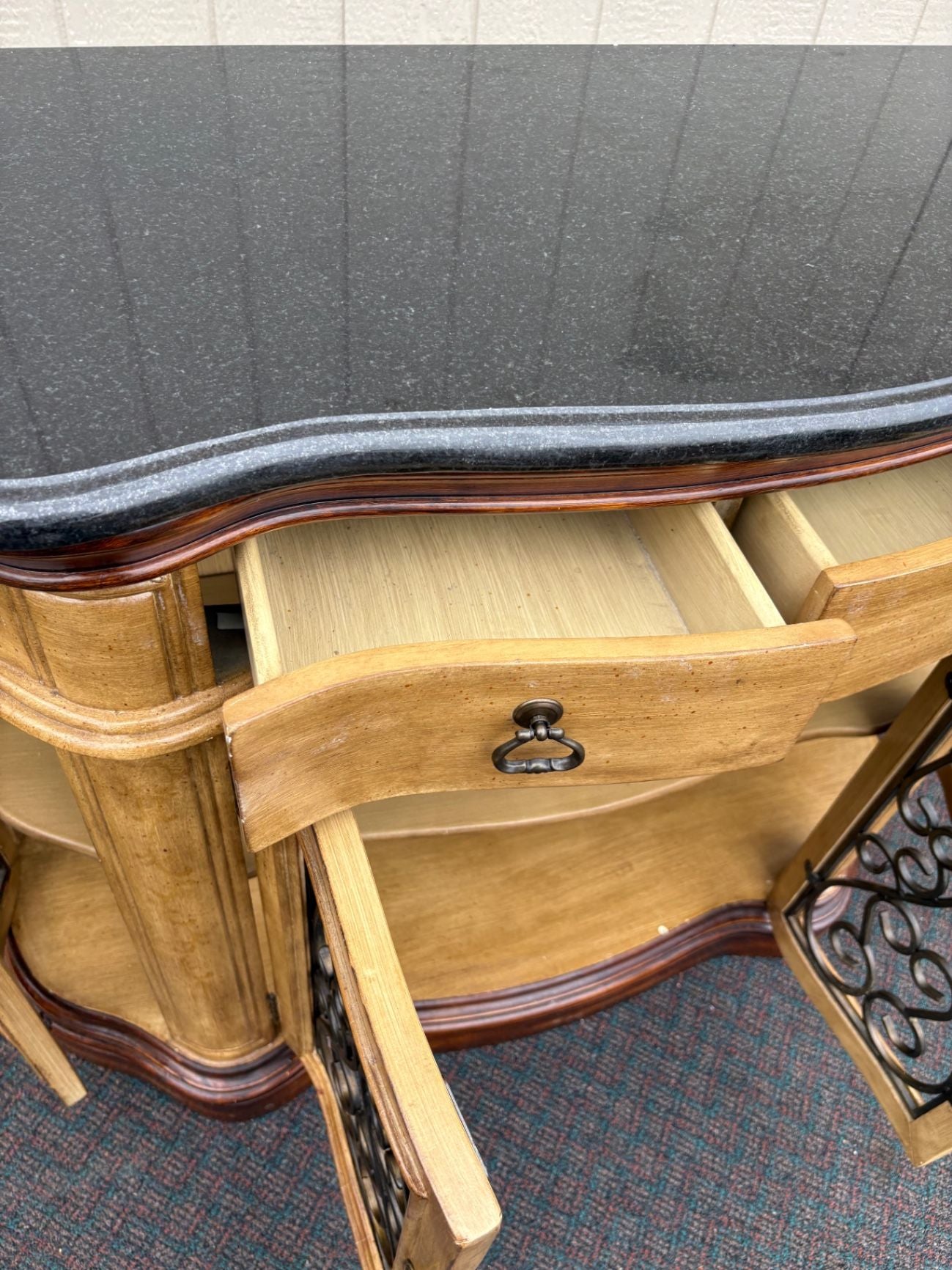 | Features | Black granite top, wrought iron door inserts, two drawers, two cabinets, curved design |