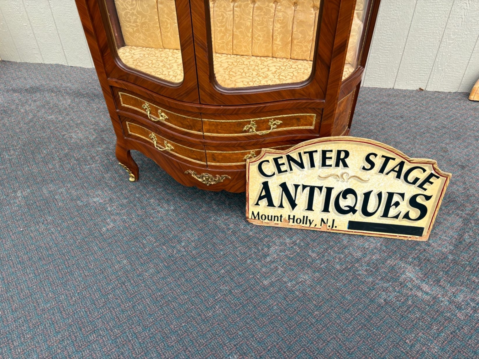 | Features | Glass shelves, gilt bronze ormolu, curved glass doors, satin interior, cabriole legs |