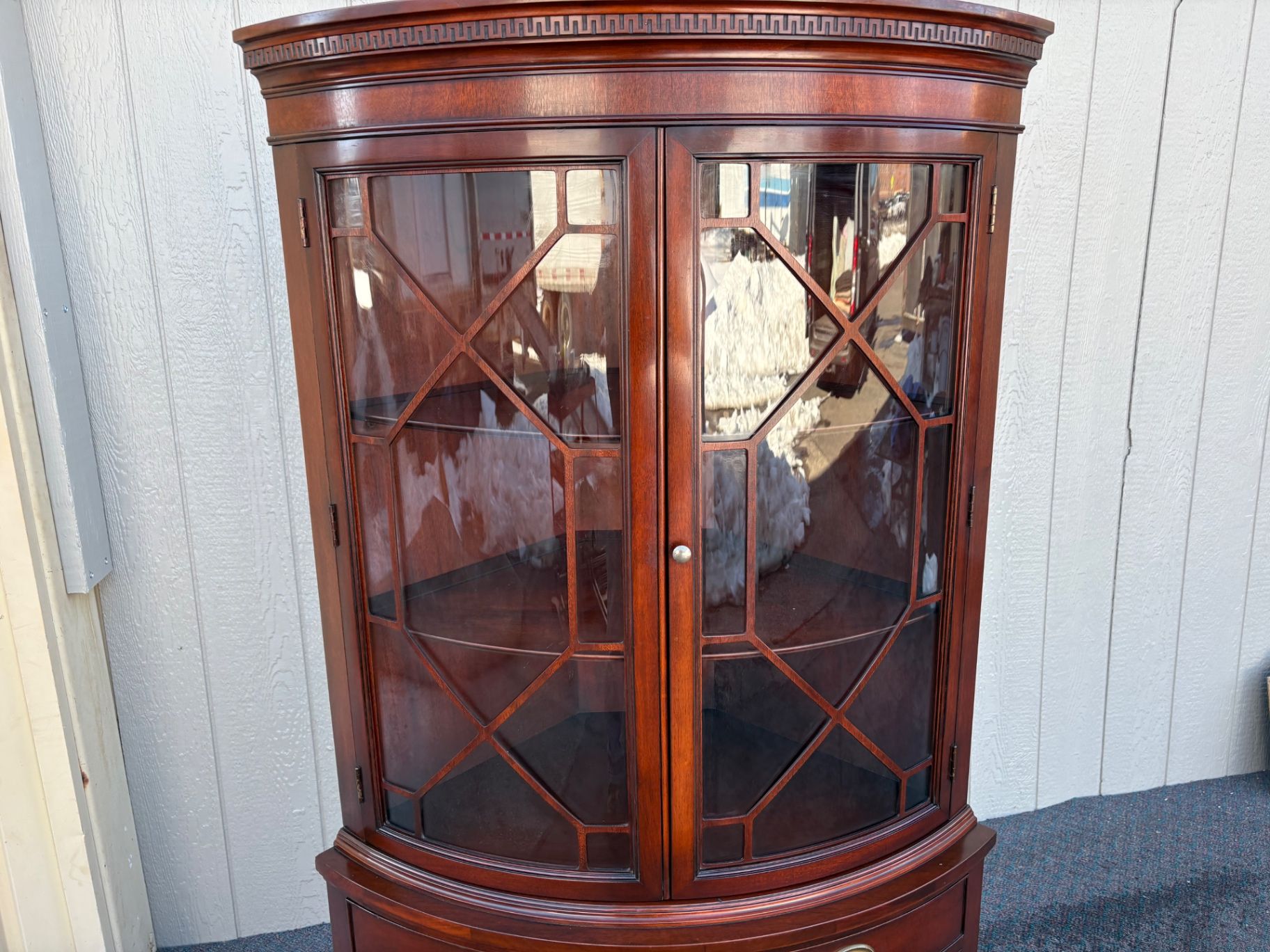 This elegant corner cabinet is crafted from rich mahogany, showcasing a timeless design perfect for any classic interior. It features beautifully detailed glass doors with a geometric pattern and a warm, glowing finish that highlights the wood's natural grain. The cabinet offers ample storage with three interior shelves behind the glass doors and additional space in the lower section, accessed via brass-handled doors. The craftsmanship is evident in the smooth curves and clean lines, making this piece both functional and a stunning focal point.