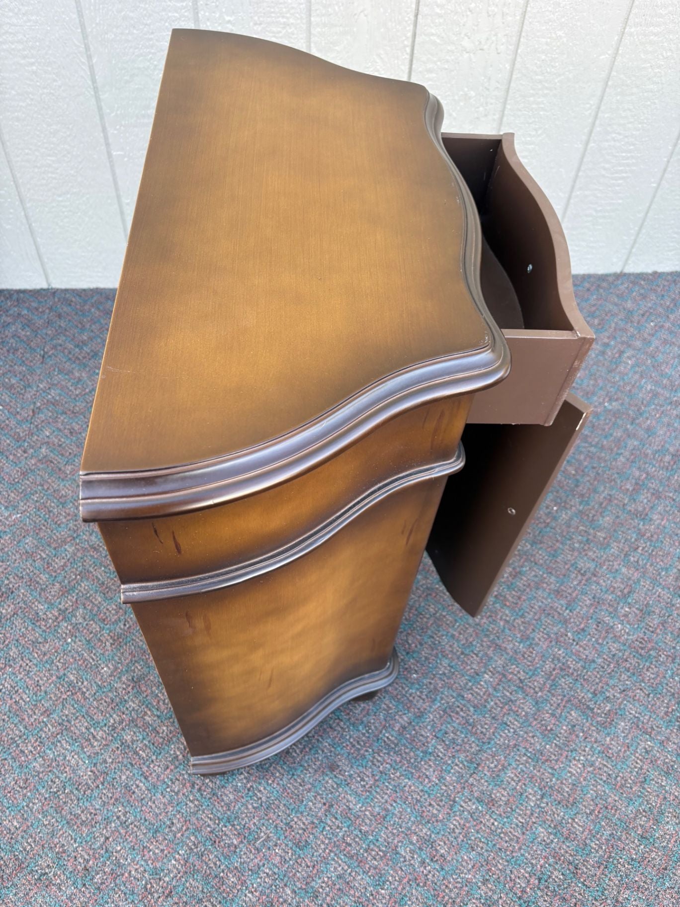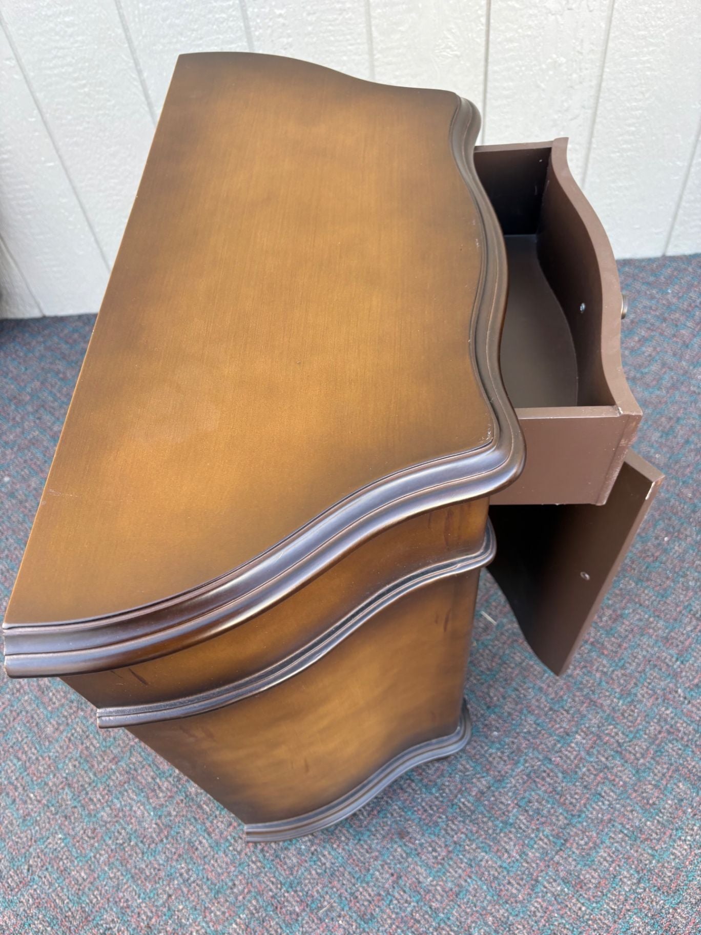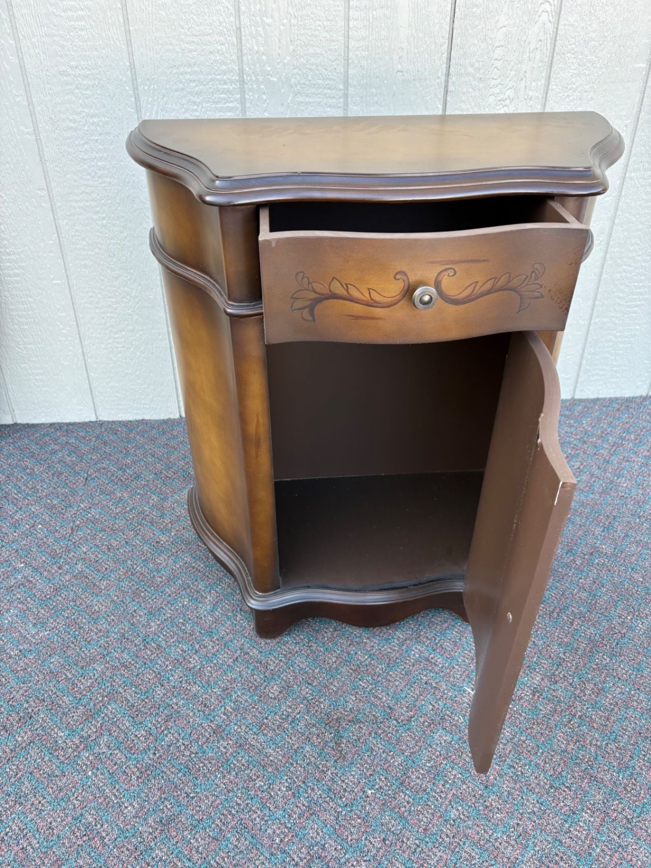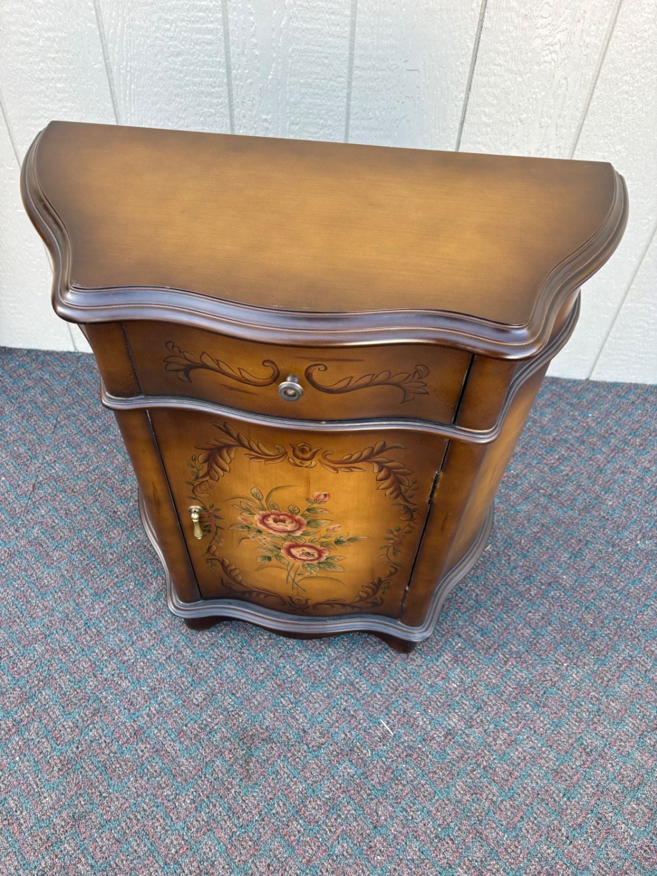 | Features | Hand-painted floral stencil, Original brass hardware, Curved design, Single drawer, Cabinet door |