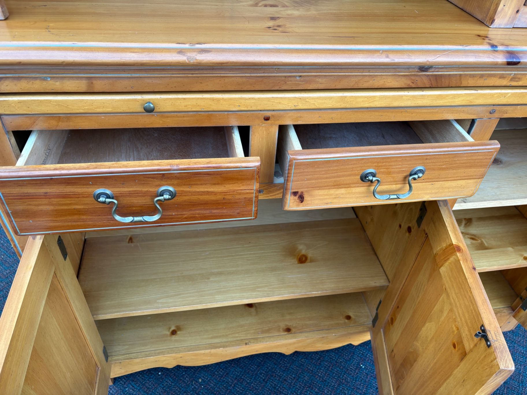 This charming two-piece pine cupboard cabinet exudes rustic elegance and practicality. Crafted from solid pine, it features a warm, honey-toned finish that highlights the natural grain of the wood. The upper section boasts two glass-paneled doors, perfect for displaying cherished items, while the lower section offers additional storage with solid wood doors and drawers. The cabinet is adorned with classic hardware that complements its timeless design. With its ample storage and display options, this piece is both functional and visually appealing, making it a versatile addition to any home.
