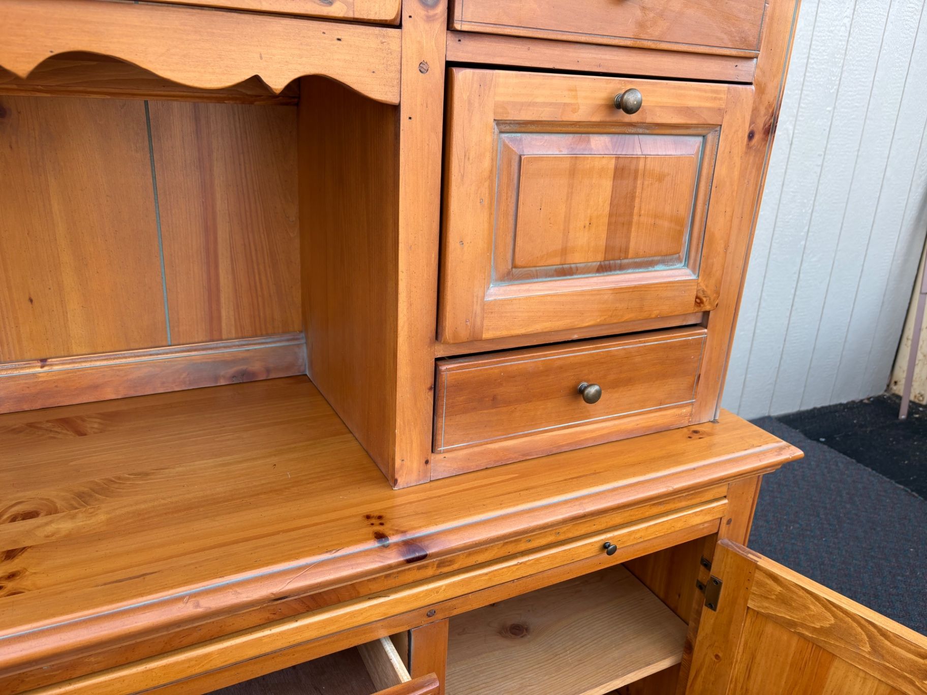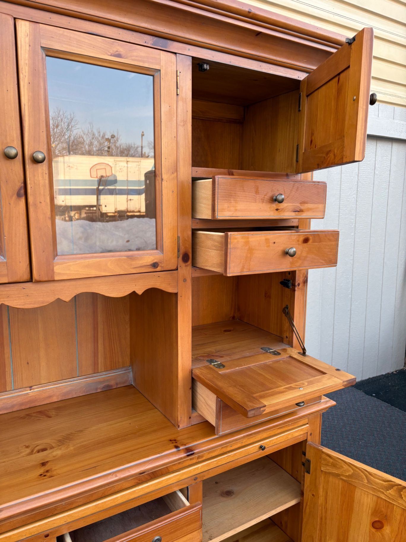 | Features | Two-piece design, glass-paneled doors, solid pine construction, original hardware, ample storage |